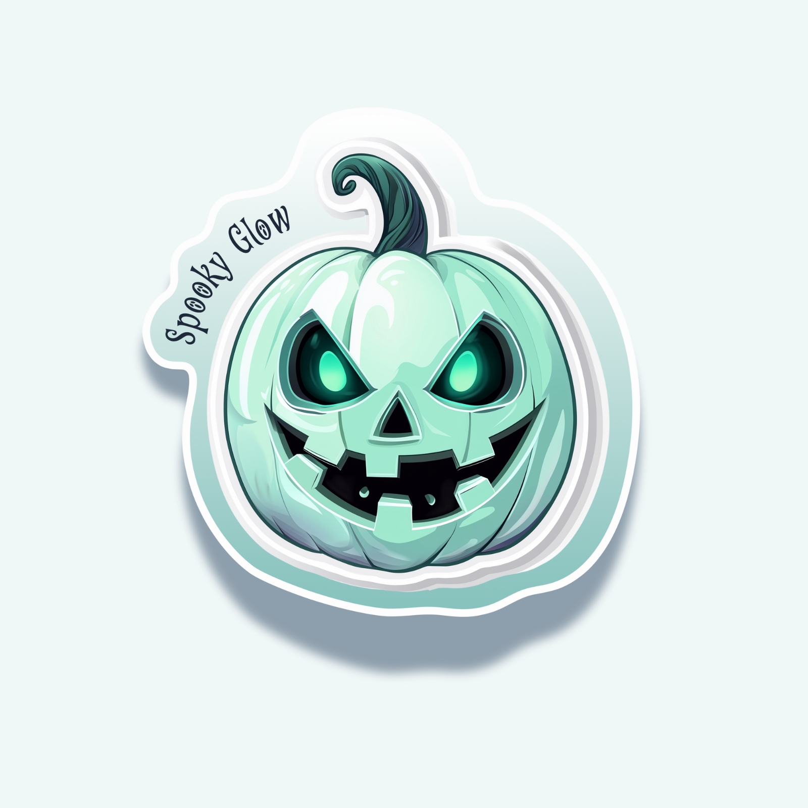 The Spooky Glow sticker brings a haunting shine with its mint-green pumpkin and glowing eyes. A bold twist on the traditional jack-o’-lantern, perfect for fans of eerie yet modern Halloween style.
